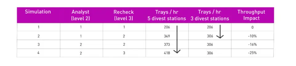 Using our simulation tool we were able to show that a reduction of up to 25 percent in tray throughput per hour could be expected when only three out of five divest stations are being used.